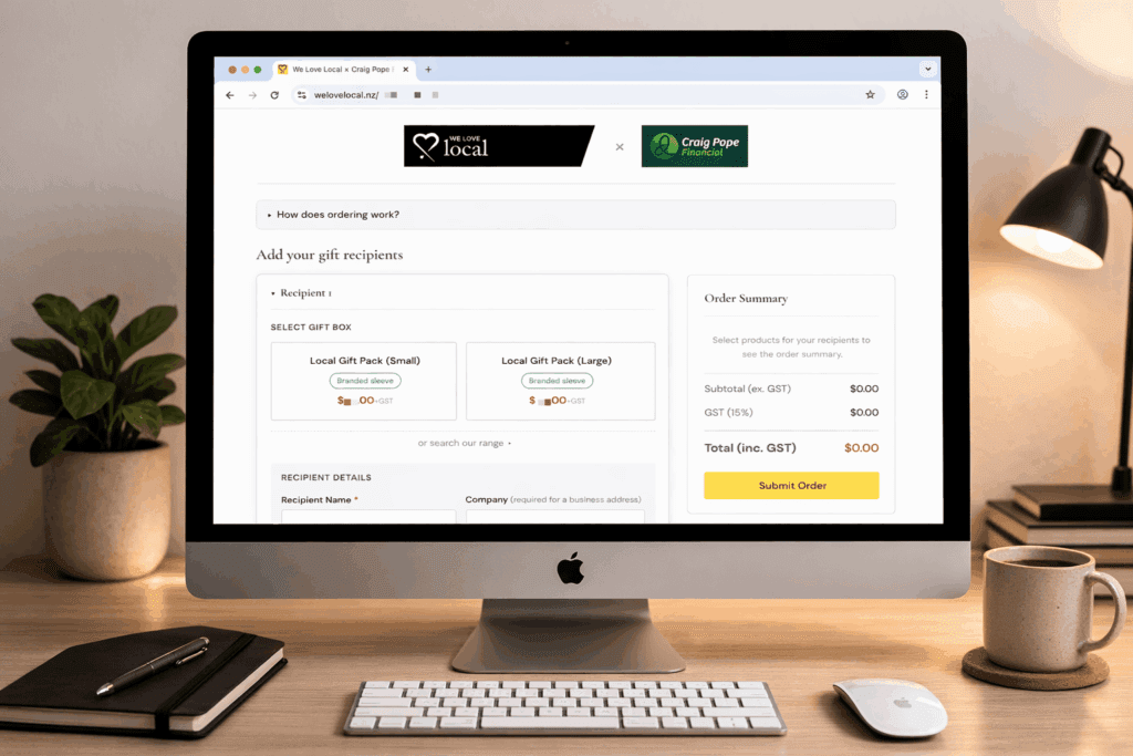 We handle the setup. You tell us what kind of gifts suit your business and your budget, and we put together a curated selection for your page. If you already have branded sleeves with us, your curated gifts show up with your logo and colours. The page is typically live within five to seven business days.