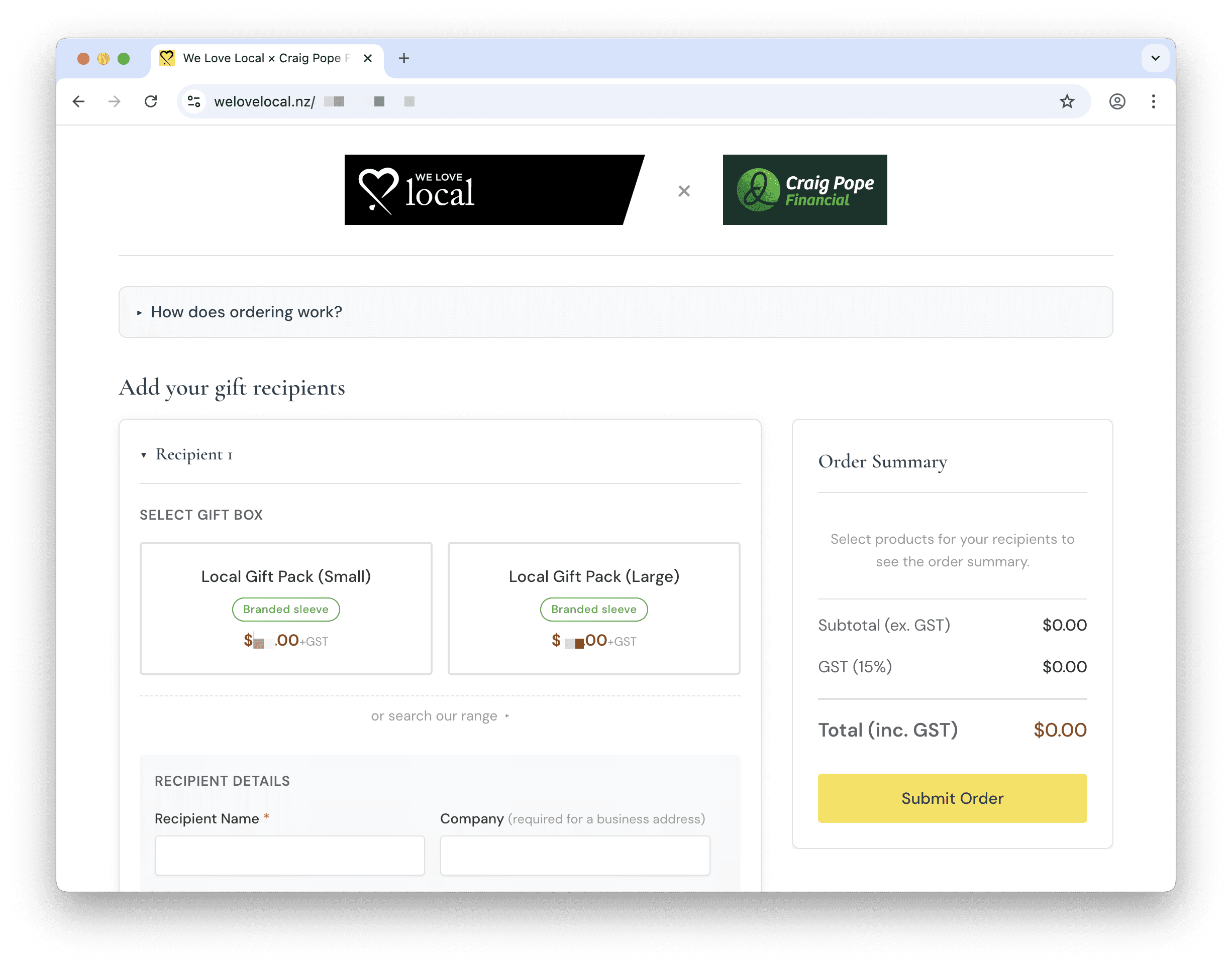 Your own branded gift page featuring curated local gifts. Order one or a hundred. We handle the packing and delivery.